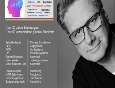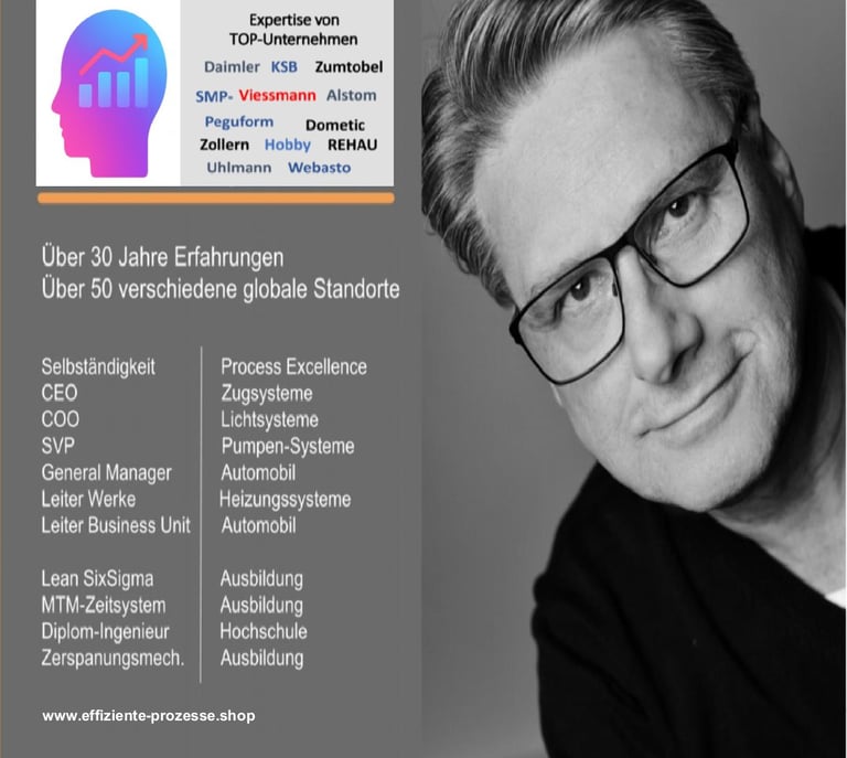 Mit meinen über 30 jährigen Erfahrungen verbinde ich Theorie und Praxis in Effizienz steigern, Process Excellence und kontinuierliche Verbesserungen. Ihr Experte in Lessons Learned für nachhaltigen Erfolg und Transformation. Nutzen Sie mein Interim Management, Coaching und meine Weiterbildung in effiziente Prozesse gestalten.